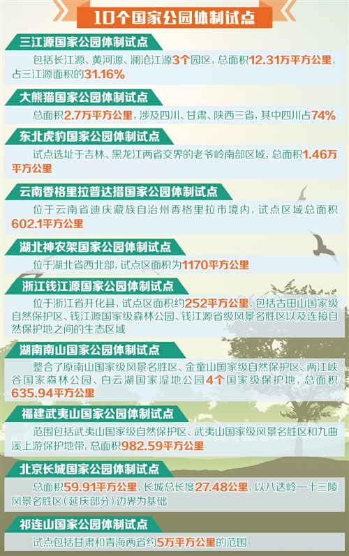 目前我国已有10个国家公园体制试点。根据《建立国家公园体制总体方案》,到2020年,建立国家公园体制试点基本完成,整合设立一批国家公园,基本建立分级统一的管理体制,国家公园总体布局初步形成。 国家公园在世界上已有将近150年的历史,但在我国尚属新生事物。中国的国家公园什么样、怎样建、如何用?记者就此采访了有关专家学者 为何建? “我国从1956年开始建立自然保护地,现在有将近18%的国土面积被各种类型自然保护地覆盖,应该说取得了很大成就。但问题也不少,尤其是体制机制方面的问题比较严重。比如一地多名、多头管理,保护管理效能不高,盲目建设和过度开发现象时有发生等。”清华大学景观学系主任杨锐教授表示,从数量上看,我国的自然保护地规模不小,甚至超过世界平均水平,但从质量和管理成效来看,还有很大的提升空间。 ——加快推进生态文明